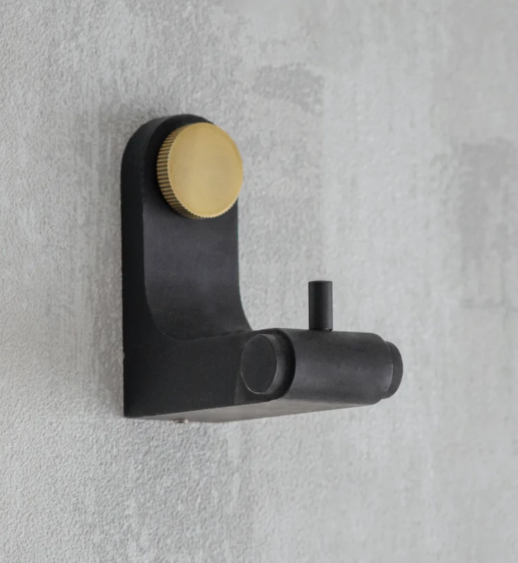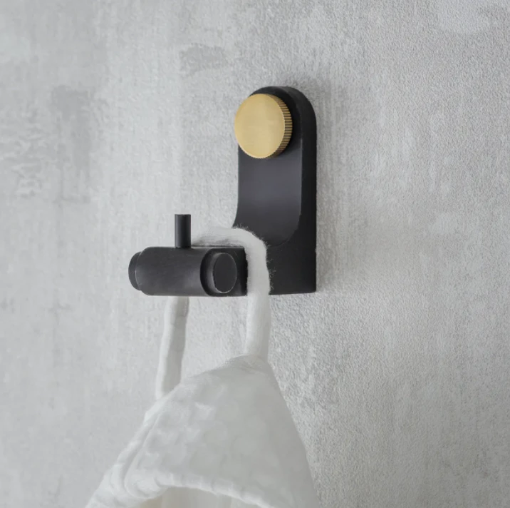 With an industrial edge, this black metal and brass hook is a great addition to a bathroom or bedroom. Use it to hang