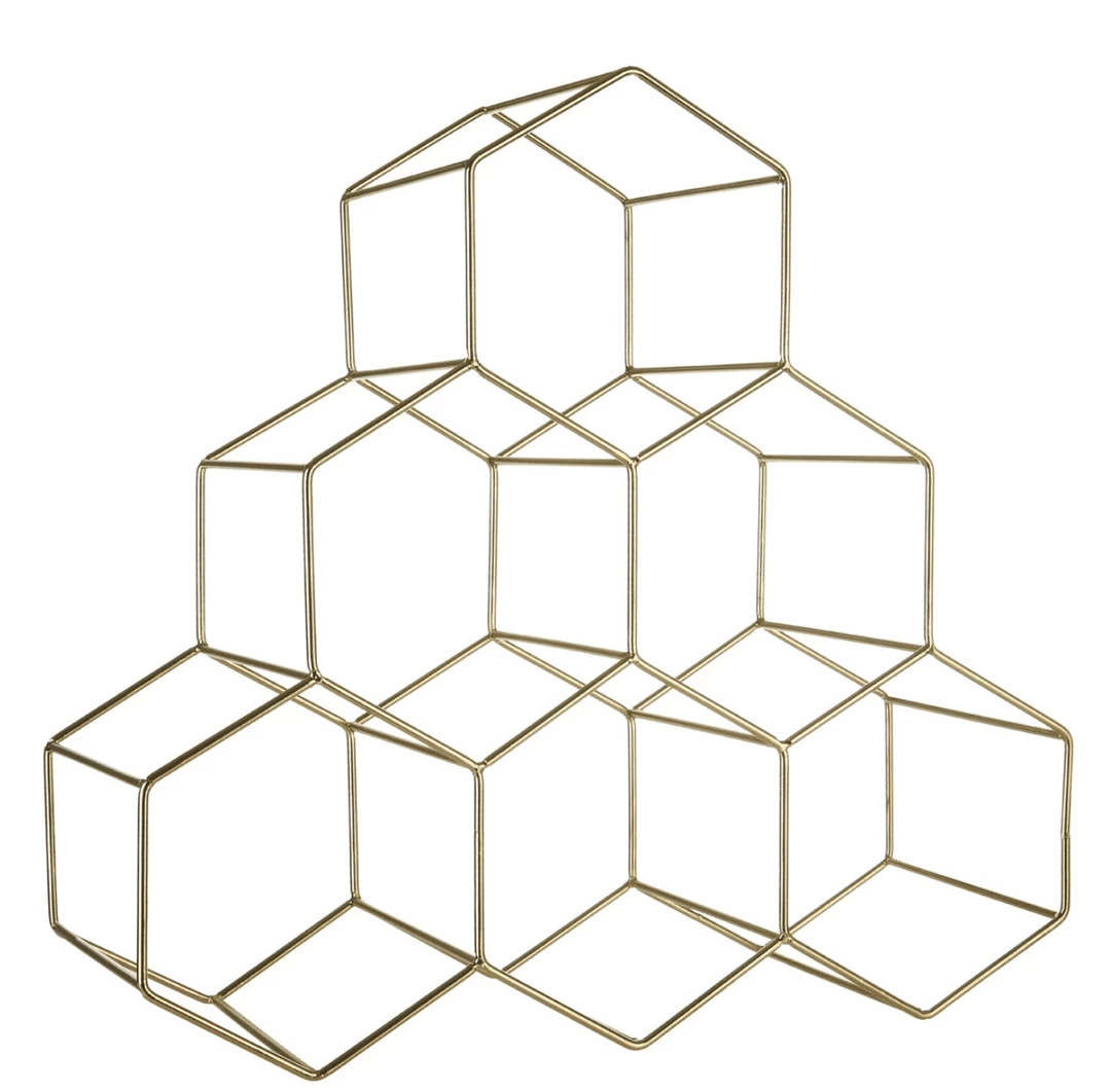 Display six of your favourite bottles of wine in this gold coloured metal wine rack. It’s distinctive geometric