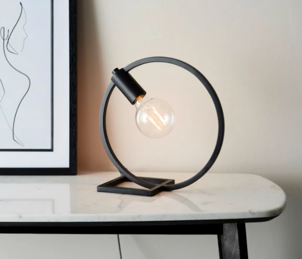 We love a statement table lamp, and this industrial style black lamp adds a great finishing touch to your home. The lightbulb is suspended from a circle of black metal, supported by a black metal base. It is simple design will look fabulous in Scandi or industrial inspired homes. Use it on a console table or sideboard for another lighting option for your living space. Or, a pair would work wonderfully either side of a bed. (bulb not included). Part of our collection of statement lighting