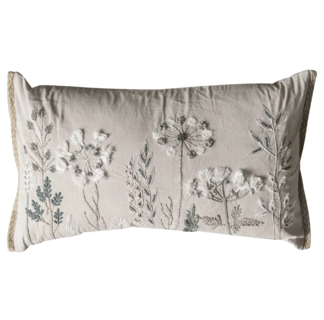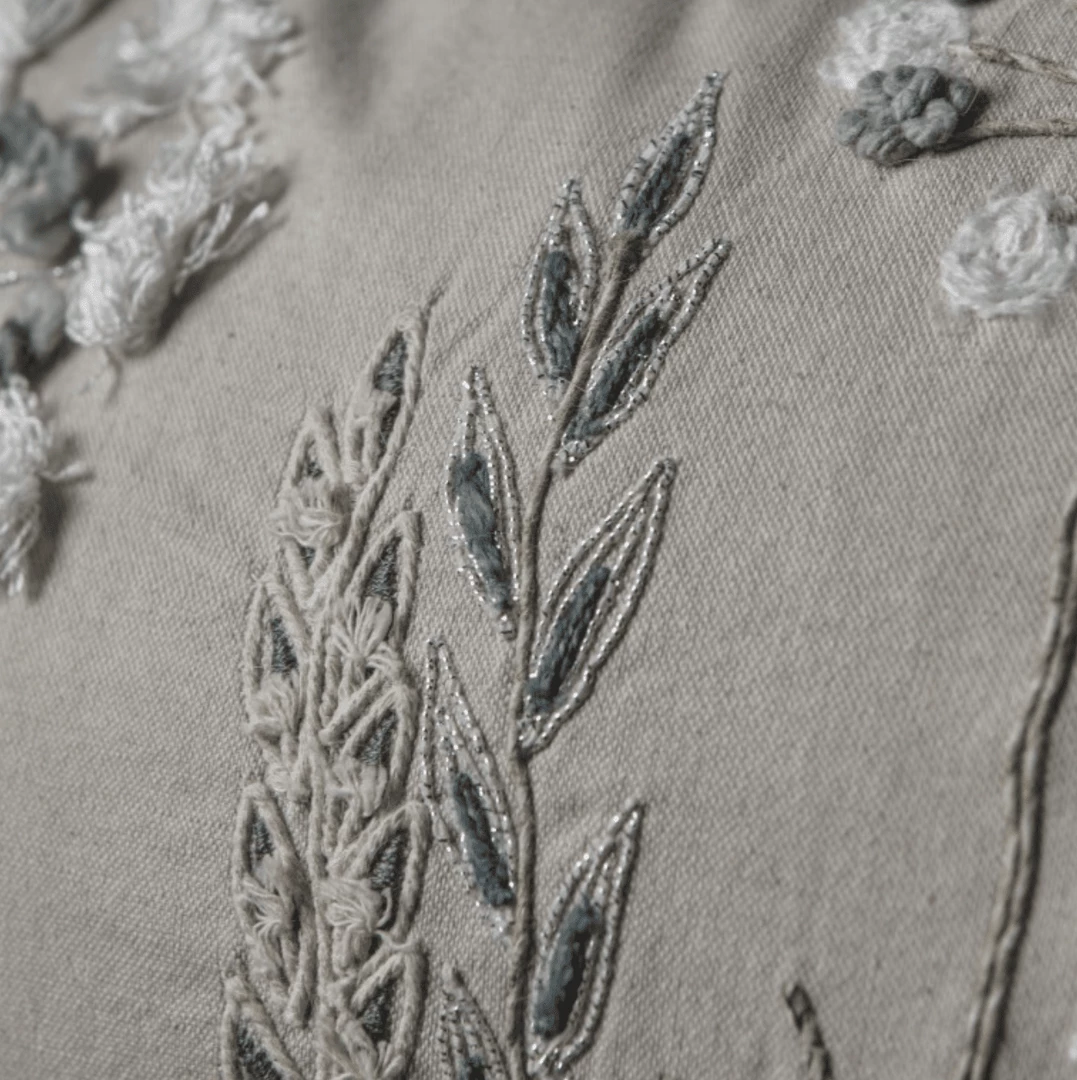 This beautiful embroidered cushion has a stunning floral design. It’s a subtle statement cushion, that’ll stand out from the crowd on your sofa or bed. The natural coloured fabric of the cushion is embroidered with pastel greens, creams and pinks as well as embellishments to create a really eye-catching design. Includes cushion cover and cushion pad. For more cushions, blankets and throws check out our soft furnishings collection.