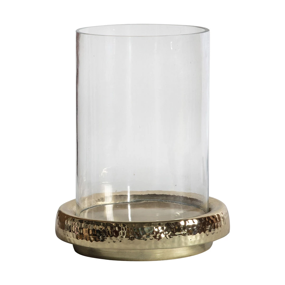 This classic-style hurricane candle holder has a hammered effect to its metal base and a simple glass cylinder. Create a relaxing atmosphere in the evenings by lighting a candle and watching the shadows dance off the walls.