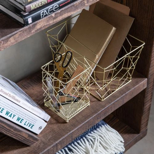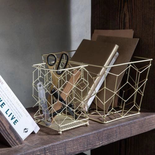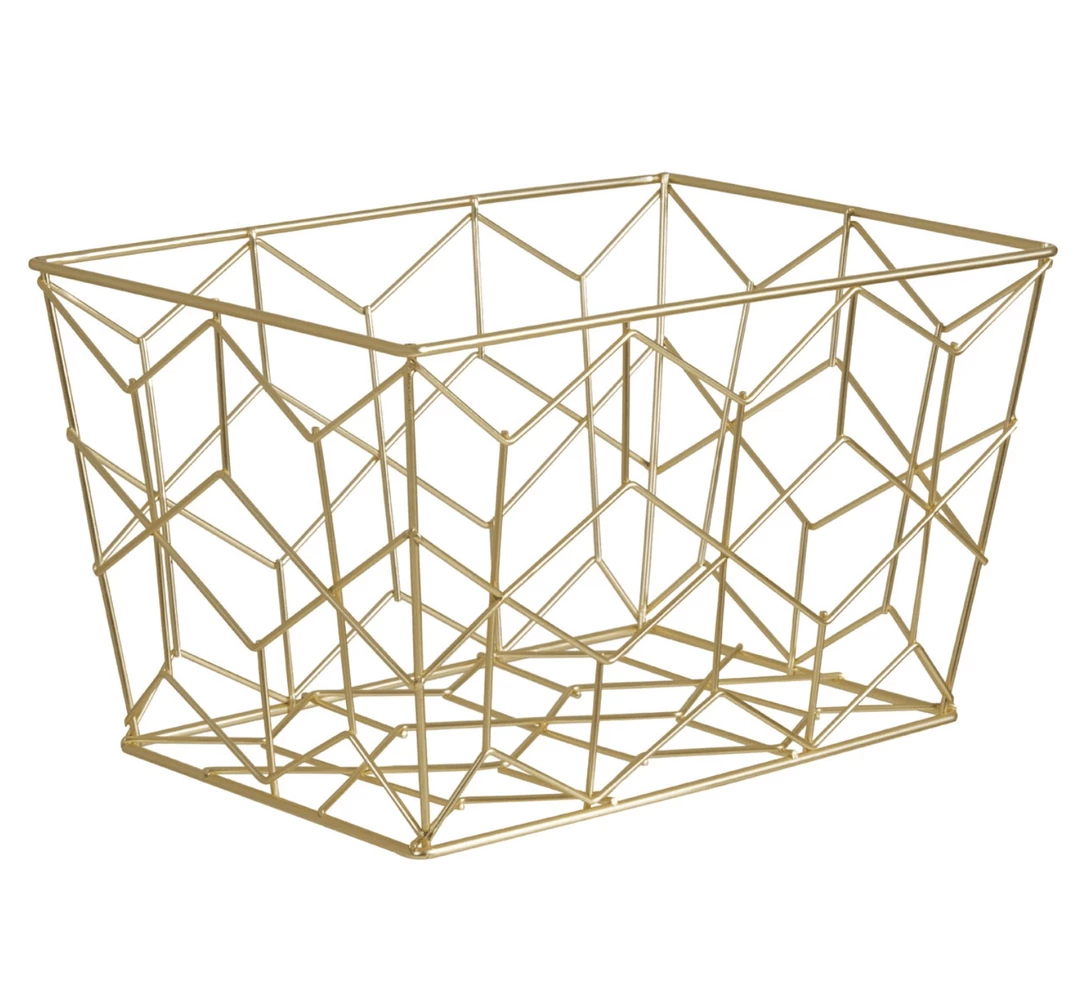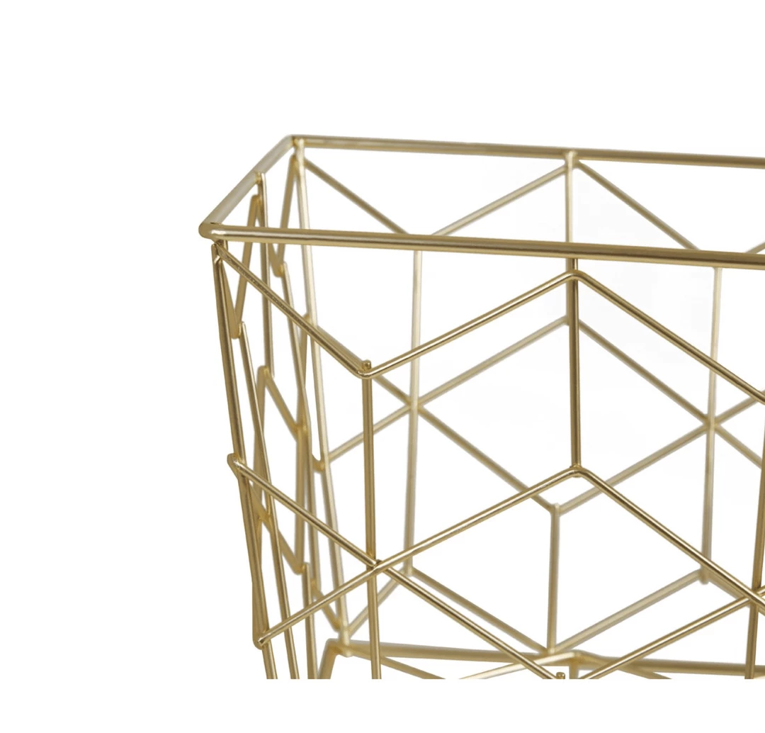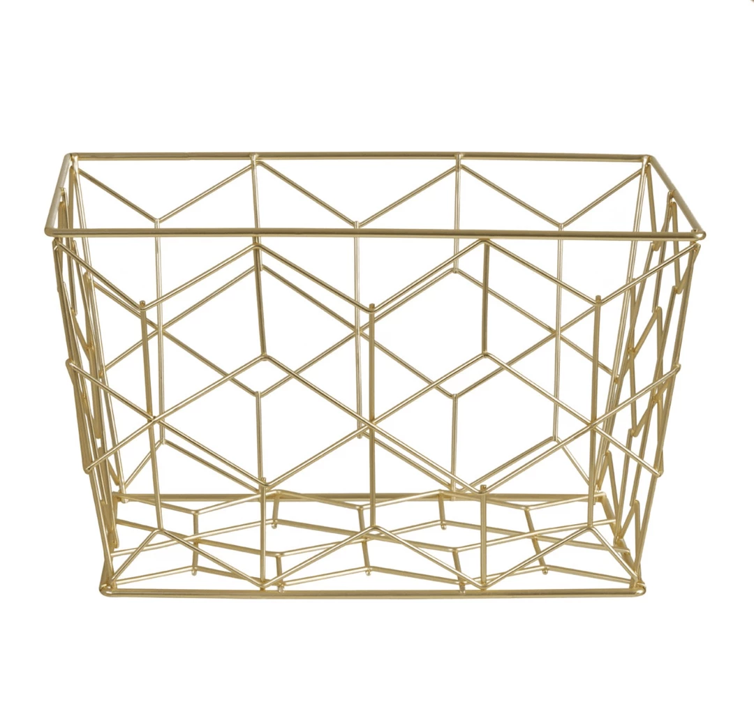 Featuring a geometric pattern, this matte gold metal storage basket is the perfect size for storing home office