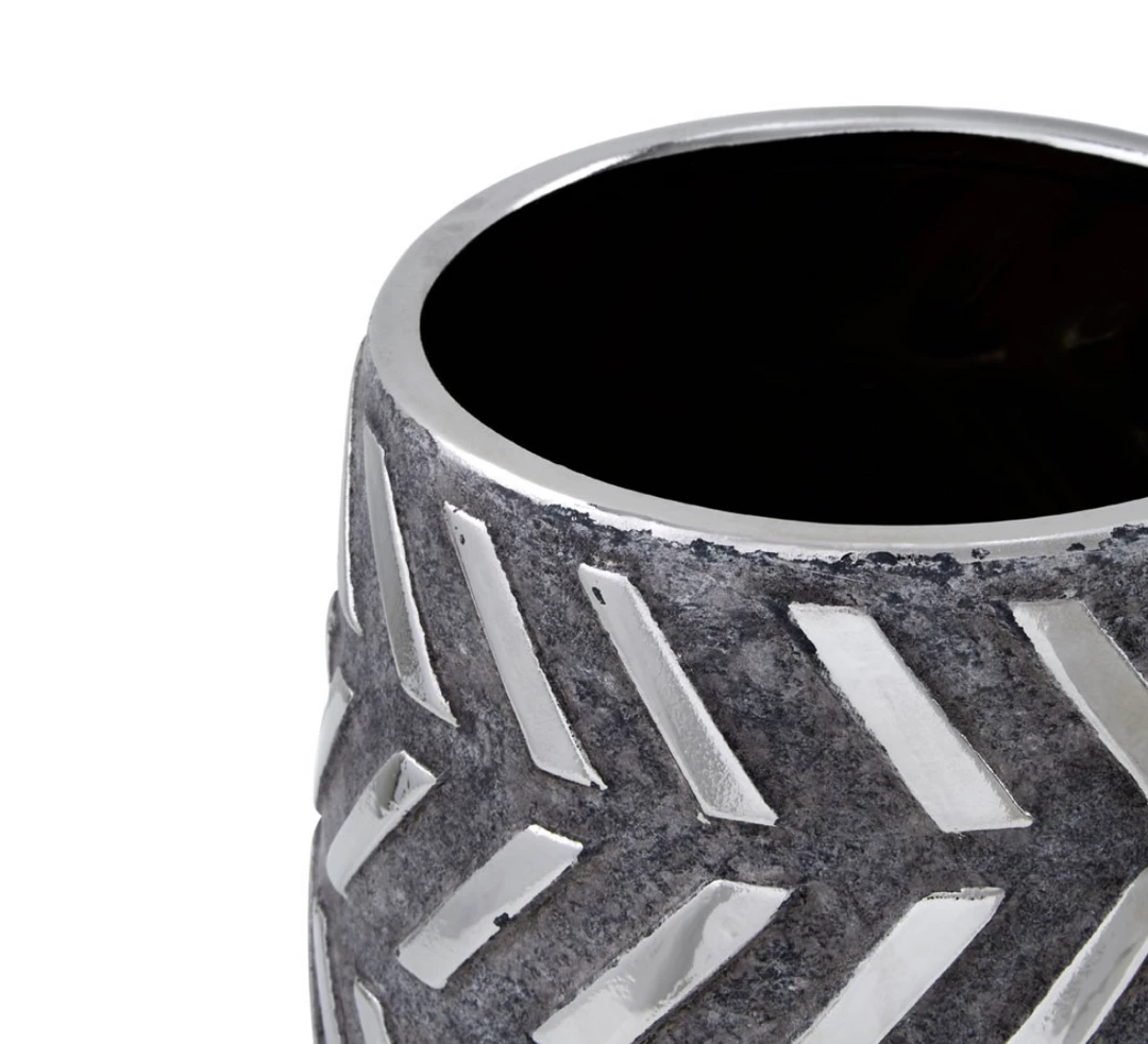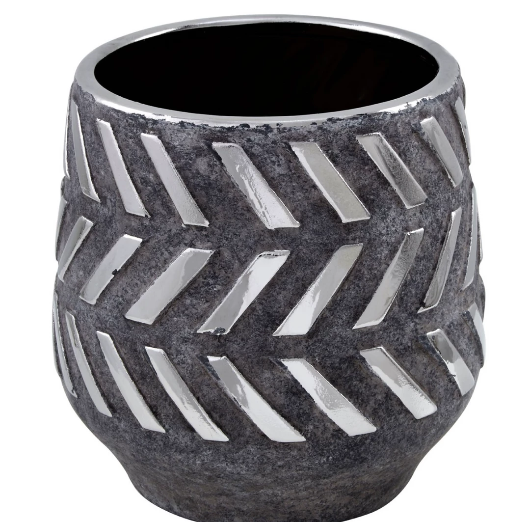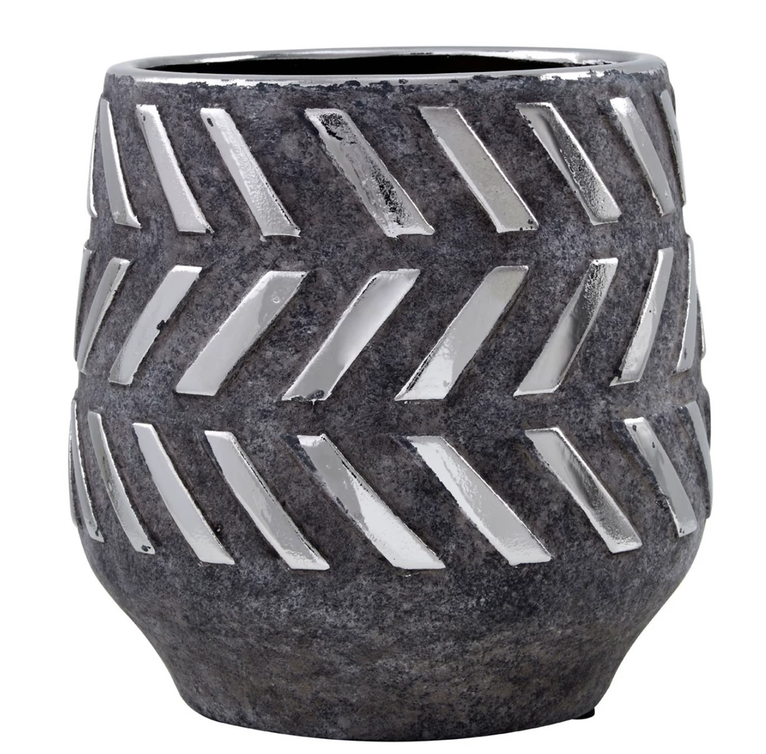 This handcrafted stoneware pot has a muted grey shade and metallic silver detailing. It’s a combination of luxe and