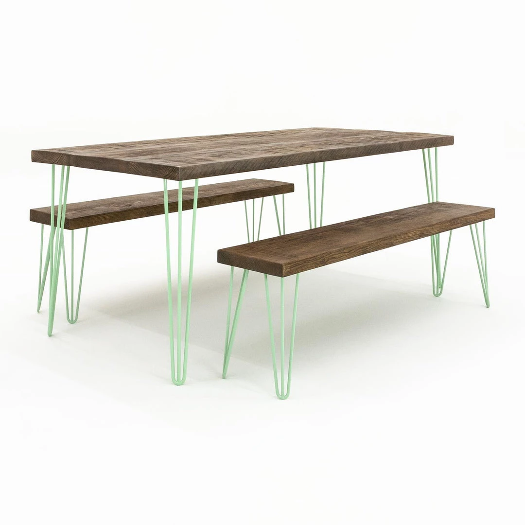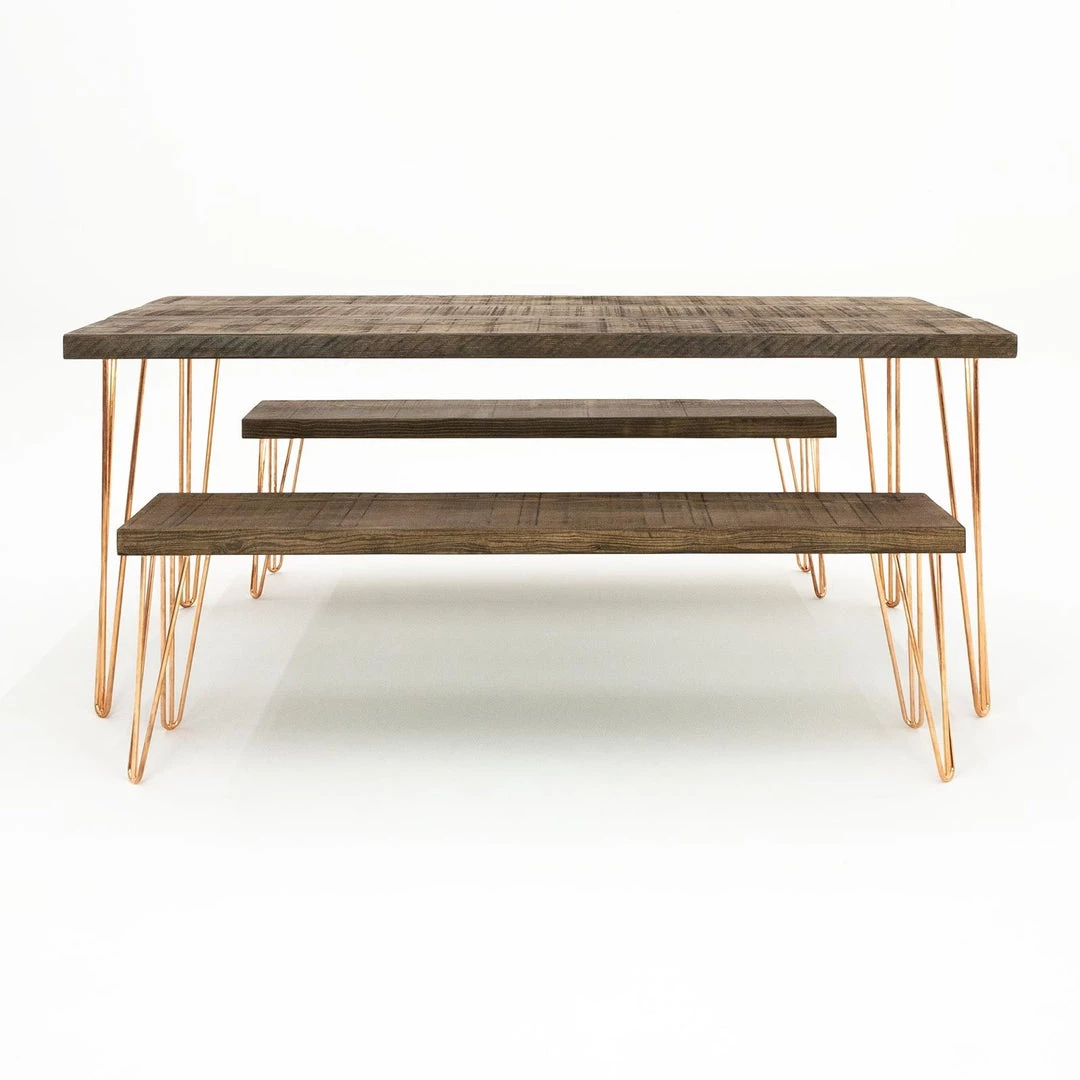 Industrial three-rod hairpin legs elegantly support the chunky solid wood rustic tops of this dining table and benches. It’s a minimalist dining set that looks perfect in pared back spaces with clean lines. It also works equally well in smaller dining rooms, where it creates the illusion of space with its barely-there legs.