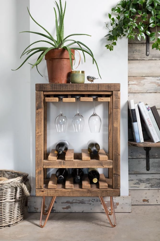 Industrial hairpin legs, elegantly support this chunky solid wood wine rack, which can store up to six bottles of wine and nine wine glasses. This minimalist wine rack is perfect for maximising storage space in your dining room.
