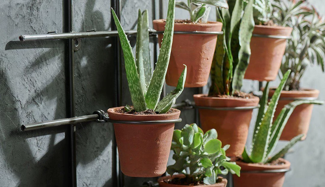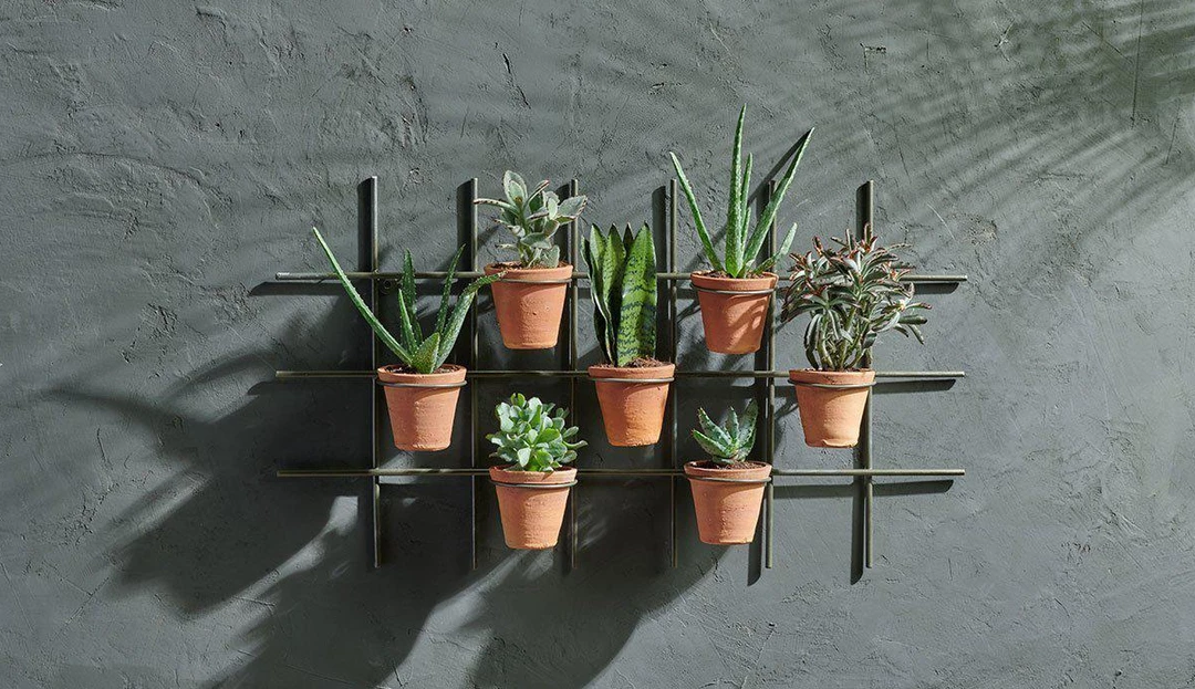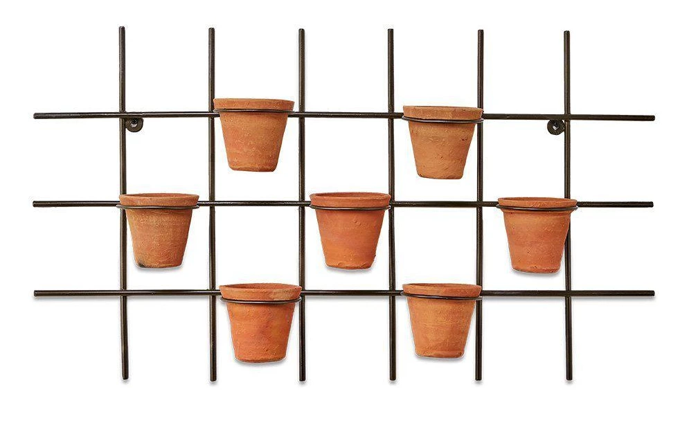 Bring life to a dull garden wall with this beautiful wall planter. A metal grid creates a statement frame, on which seven terracotta pots sit, ready to be filled with aromatic flowers, herbs or succulents.