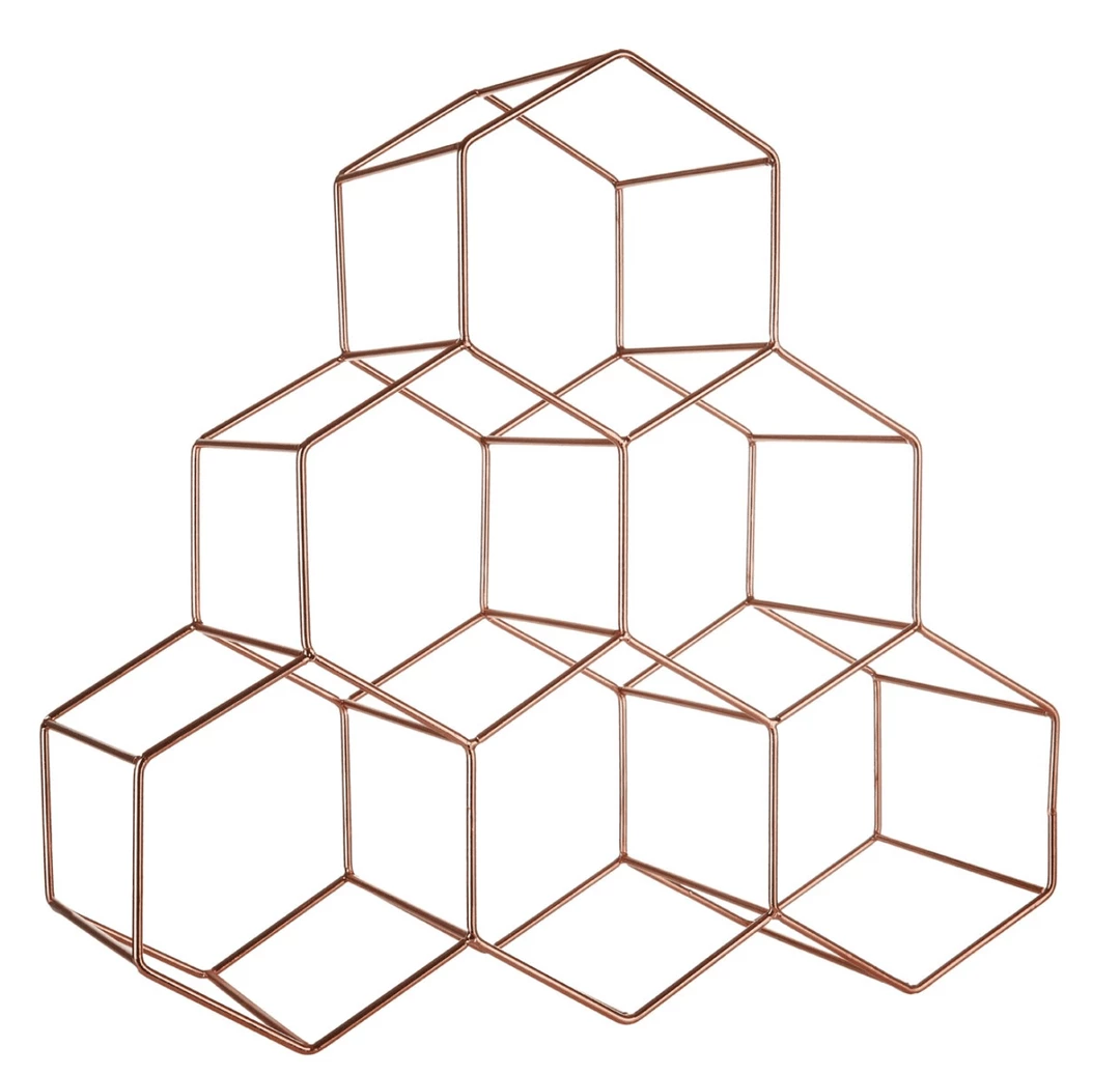 Display six of your favourite bottles of wine in this rose gold coloured metal wine rack. It’s distinctive geometric