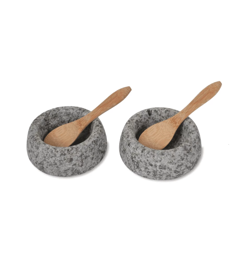 A set of two small bowls, crafted in granite, and two bamboo spoons. This pinch pots are the perfect modern update on