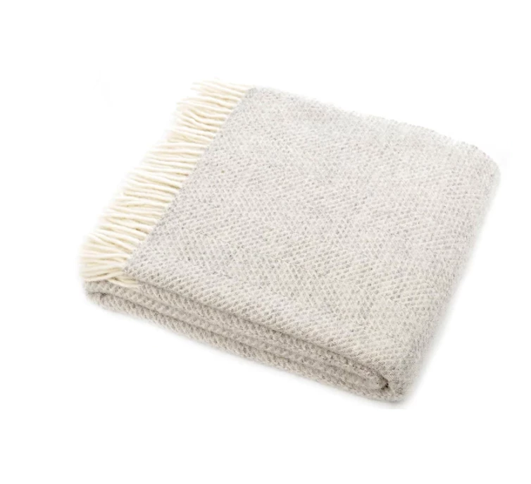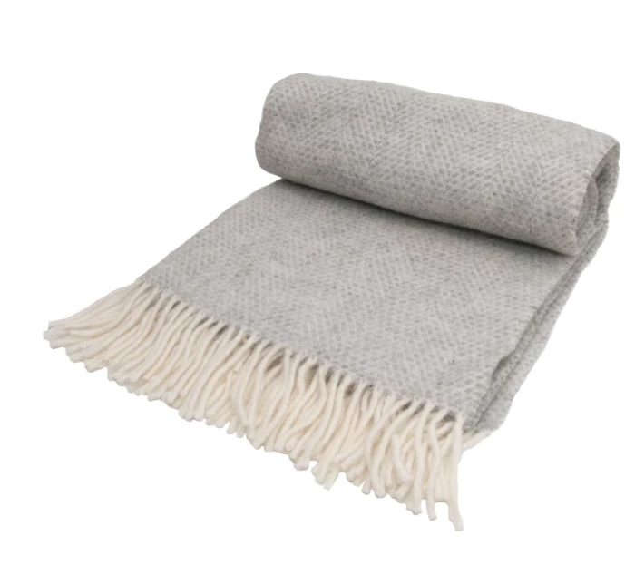 A super soft light grey woollen throw with a delicate weave that’s influenced by honeycomb and herringbone designs.