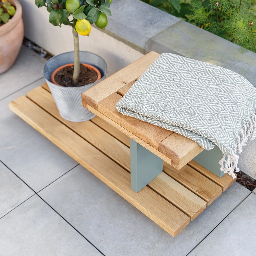 Like all natural wood furniture, your outdoor furniture needs regular care and attention. We recommend that you refresh the finishes every year, using teak oil on the solid oak and quality exterior paint on the painted timbers. If you decide to closely match the colours we used on the painted wood, we would recommend Cuprinol Garden Shades Urban Slate and Wild Thyme as close colour matches (information correct as of May 2021).