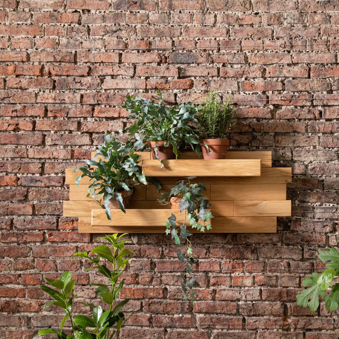 The Wylam Solid Oak Wall Planter is made from kiln-dried solid oak and hand-finished with a protective oil. The sides of the planter shelves are made from tanalised pine and hand-painted in a choice of two colours – Dark Slate (as seen in the pictures) or Sage Green. You can order samples of the finishes from our Samples section to see the finish that the protective oil gives to the kiln-dried oak, and help you choose the colour too.